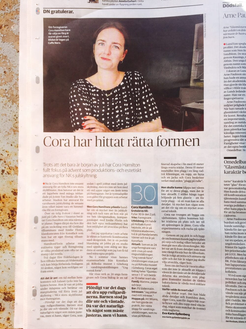 Idag skriver DN om Cora Hamilton, tidigare studerande vid Handarbetets Vänners skola.