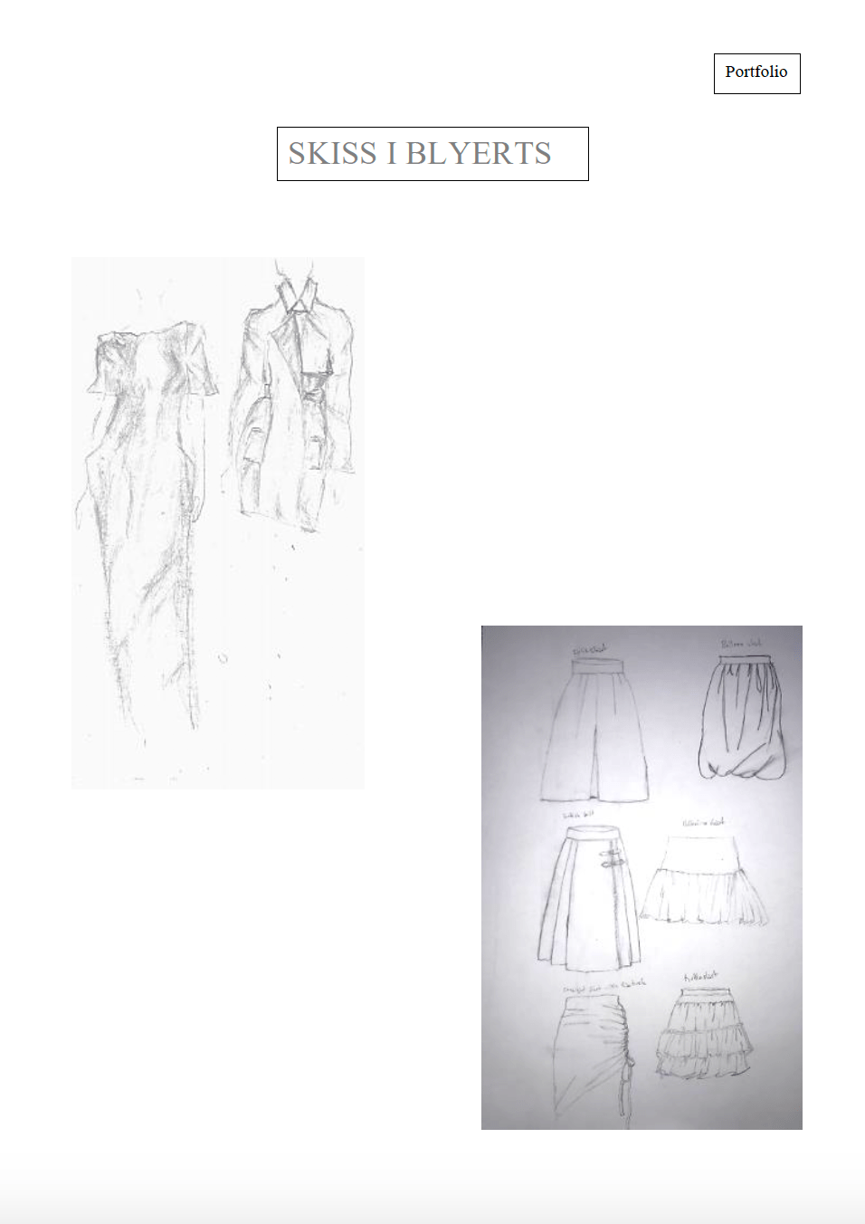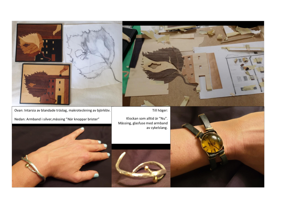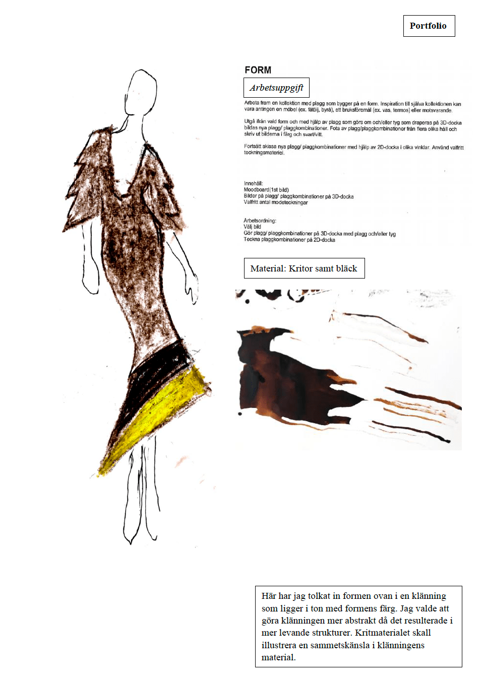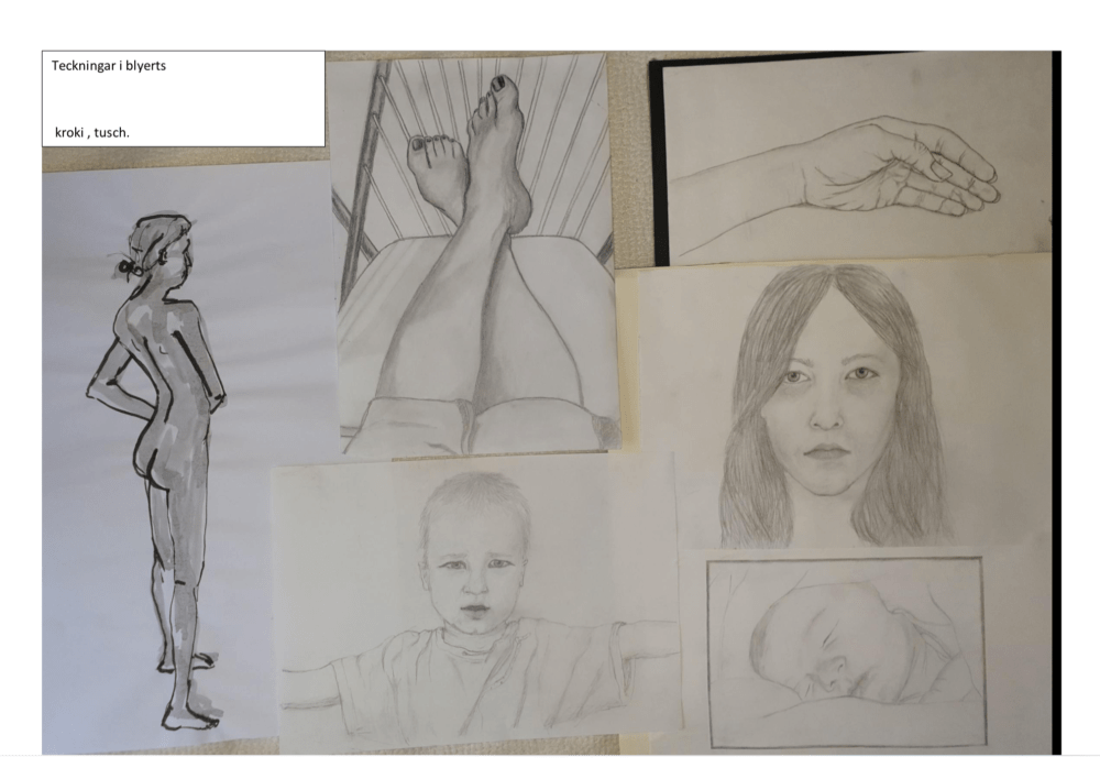 Det kan exempelvis vara textila arbeten, idéskisser, foton, teckningar, kroki eller collage. Minst ett arbete bör dock vara en handritad skiss eller teckning utförd i blyerts, tusch, kol eller krita.